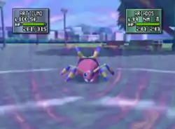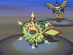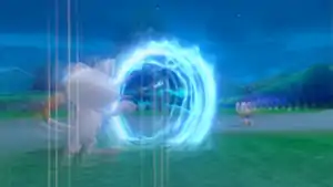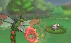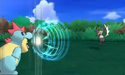 Vibrava shakes its wings and they become surrounded in a white aura, sending purple shockwaves from its wings to the opponent. | ||