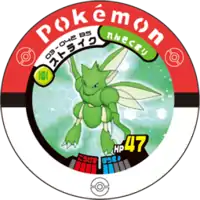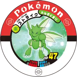 Scyther (Japanese: ストライク Strike) is a Pokémon Battrio puck. It is part of the Mewtwo's Challenge expansion.