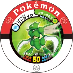 Scyther (Japanese: ストライク Strike) is a Pokémon Battrio puck. It is part of the Challenging the Myths expansion.