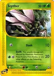 Scyther (Japanese: ストライク Strike) is a Grass-type Basic Pokémon card. It is part of the Aquapolis expansion.