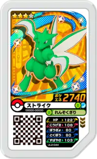 Scyther (Japanese: ストライク Strike) is a Grade 3 Pokémon Ga-Olé disk. It is part of the second Ultra Legend set.