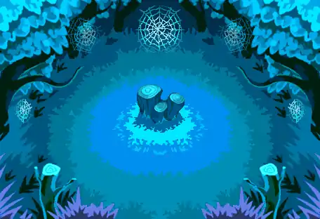 It is a dark forest, with an eerie blue half-light sifting through the trees. There are several large spiderwebs at the back, possibly from the Spinarak and Ariados that reside here. Three tree stumps sit in the middle.