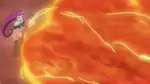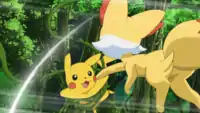 | Description: Fennekin combines her Flamethrower attack with Pikachu's Thunderbolt, a Dark Pulse from Jessie's Pumpkaboo, and a Psybeam from James's Inkay to create a swirling blast of energy. This was used to defeat a Pokémon hunter and his Rhyperior. | |||