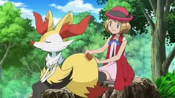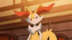 In Mending a Broken Spirit!, Serena, Pancham, and Braixen began to think of a strategy on what they should do in their next Showcase. During their training, Braixen's branch broke after getting hit accidentally by Pancham's Stone Edge, devastating Braixen. When the others tried to get a new one, she turned them down as she felt her branch could never be replaced since she and Serena had promised to win the title of Kalos Queen with that branch. Upset Braixen ran into the forest with Serena and Pancham chasing her. In the forest Serena encountered Braixen with a disguised James, who made Serena realize why Braixen was so attached to her branch. Trying to find a way to fix Braixen's stick, they went to the Pokémon Center. There Nurse Joy informed them on a 'tree surgeon' named Woodward. Serena, Braixen, Pancham, and James then headed towards Woodward's work place. There Woodward challenged Serena to a battle in order to determine her strong feelings for it. Braixen faced Woodward's Gallade. Unable to use Flamethrower, Braixen used Scratch, but quickly dodged the attack. After avoiding another Scratch, Gallade managed to hit Braixen hard with Slash. Gallade then used Psycho Cut, which Braixen managed to dodge. Then Team Rocket appeared to capture Pikachu. Braixen, however, attacked them and learned Fire Blast and defeated them after focusing her feelings, but in the process shattering her stick. Pancham then showed a stick it had been holding onto to give to Braixen, so she could move on. Serena and her Pokémon put their hands together on the stick, making another promise to win the title of Kalos Queen, and Braixen accepted the new branch. Serena then put a bow on the branch as a sign of their promise. Serena and Woodward then continued their battle. Braixen avoided Gallade's Psycho Cut and then used her newly learned Fire Blast to deal serious damage on Gallade. Woodward then stopped the battle. Later, the gang tied Braixen's broken branch pieces together onto a young sapling so it could grow into a new life and be useful later on. Serena and Braixen made a promise to see the sapling after winning the Kalos Queen title and headed off to their next location.