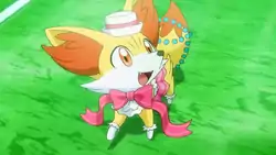 In Dreaming a Performer's Dream!, Fennekin watched the Lagoon Rookie Class Showcase with her Trainer as well as Shauna and her Bulbasaur, watching Aria and her Braixen as well as Kayleigh's performance, until it was interrupted by a wild Pancham. Later she looked for Chespin after it chased after the same Pancham. She found Pancham and led Serena to it. After a while, Serena decided to catch Pancham since it liked performing and Serena wanted to be a Pokémon Performer, so Fennekin battled Pancham. It went for a Scratch but was captured by Team Rocket, as Jessie wanted a Braixen like Aria. However she was rescued thanks to the efforts of Fletchinder, Pancham, and Chespin. After Team Rocket was sent away by Pikachu, Fennekin and Pancham battled again, although Pancham was strong and escaped the Poké Ball once, she defeated it with Flamethrower and Hidden Power which allowed Serena to catch Pancham. She was later seen when Serena was announcing her dream to Fennekin and Pancham.