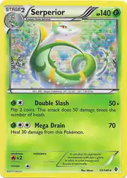 Mega Drain is a move in the Pokémon games that Serperior can learn. Double Slash is a variation of Slash, a move that Serperior cannot learn. This card's Pokédex entry comes from Pokémon Black.