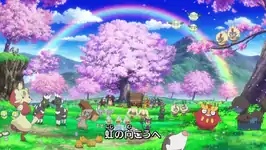 In a meadow, Cilan is conducting the song, which is being sung by Ash, Iris, Cilan, and all of their Pokémon. Around them, the wild Pokémon are also singing and dancing. Team Rocket is sitting on a cliff nearby watching, and then join in on the singing as the camera pans out.