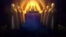 In the anime, the Seven Sages appeared in a flashback in Secrets From Out of the Fog!. They, along with Ghetsis, were leading a ceremony involving N at N's Castle. However, the ceremony was interrupted when Reshiram suddenly appeared and set the Castle on fire, causing all of them excluding Ghetsis to flee in terror. Unlike their game and manga counterparts, the Seven Sages (except Ghetsis) appear to be young and have no distinct identities.