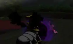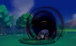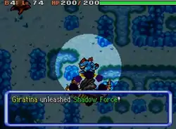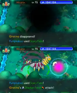 The middle of Giratina's head crest glows light blue and Giratina's body turns black and disappears as soon as an attack is about to hit it. Seconds later, it reappears behind the opponent and attacks it. | ||