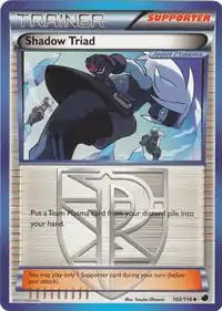 Shadow Triad was introduced as a Supporter card in the Pokémon Trading Card Game during the English Black & White Series (the Japanese BW Era). First released in the Thunder Knuckle expansion, it later debuted in English in the Plasma Freeze expansion, with both prints featuring an illustration by Yusuke Ohmura. Shadow Triad allows the player to take a Team Plasma card from their discard pile and put it in their hand.