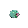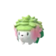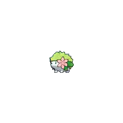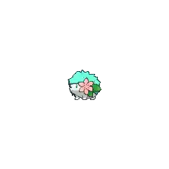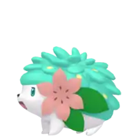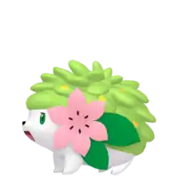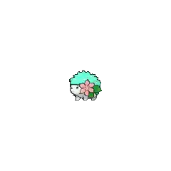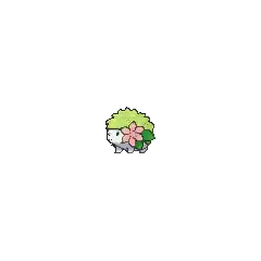Shaymin is a small, white hedgehog-like Pokémon. In Land Forme, it has green grass-like fur on its back and a pink flower with two leaves on each side of its head, which resembles the Gracidea flower. Several Gracidea-like flowers also appear on its back whenever it feels comfortable, but when it senses an impending danger, it rapidly hides it back. Its legs are short and its underside is plump. Shaymin is the smallest Mythical Pokémon to date, and one of the shortest Grass-type Pokémon.