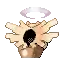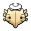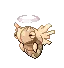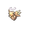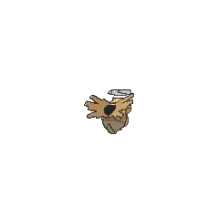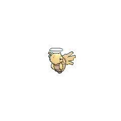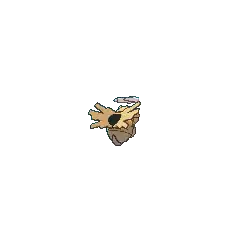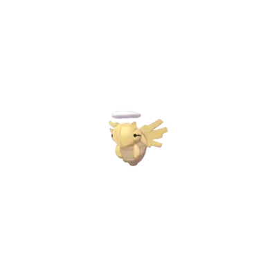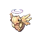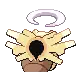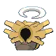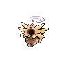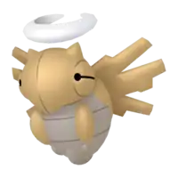Shedinja is a Pokémon based on a cicada's shed exoskeleton. Most of its body is light brown, but the abdomen is gray. It has four protrusions on its underside instead of legs; the top pair is brown, while the lower is gray. There are round protrusions on the side of its head with narrow slits for eyes. Two lines encircle its abdomen and a white halo floats above its head. On its back is a pair of tattered wings divided into three wingtips. A hole between its wings reveals that its body is completely hollow and dark, as it possesses no internal organs.