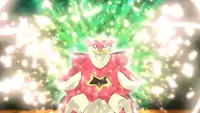Turtonator becomes outlined in a white glow while the spikes on its back also glow white. A faint red glow surrounds it and disappears in a burst. Lines of a blue aura shoot down its body and an orange aura shoot up its body, lowering its defenses and increasing its attack power and speed. | ||
