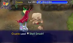 Crustle exits its shell and begins to glow white. The energy then cracks and breaks off of Crustle's body, causing it to glow red. When Crustle uses another attack while this is in effect, the broken-off energy will fuse with the attack, giving it more power and speed. | ||