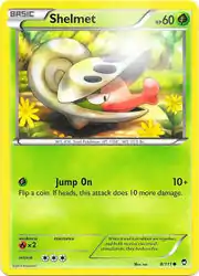Shelmet (Japanese: チョボマキ Chobomaki) is a Grass-type Basic Pokémon card. It is part of the Furious Fists expansion.