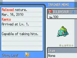 The Shiny Leaf (Japanese: かがやくはっぱ Shining Leaf) is a special item found in Pokémon HeartGold and SoulSilver. It is a rare item that can be found by the player's walking Pokémon. When it is found by a Pokémon, it will have no apparent presence other than on that Pokémon's status screen. When a Shiny Leaf is shown to the player's friend (Lyra or Ethan) in New Bark Town, the friend will explain about Shiny Leaves and request for the player to bring four more. When the player shows a single Pokémon with five Shiny Leaves attached to it, the player's Trainer Card level will increase, and they will obtain a certificate that can be viewed by speaking to their childhood friend. The friend will then craft the Shiny Leaves into a Leaf Crown, which can be seen on that Pokémon's status screen in the same spot the Shiny Leaves were.