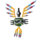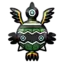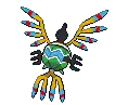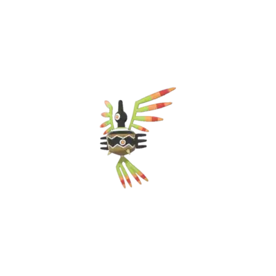 Sigilyph is a multicolored, spherical Pokémon, possessing two cyan eyes with a third on a black appendage on top of its head. Its base is mostly black, with a green zigzag pattern in the middle and a black pattern surrounded by green. Sigilyph has a pair of wings and a long tail-like appendage that are yellow with blue and red stripes on each of the "feathers", two black-colored three-toed "feet", and two small spikes at its base.