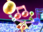 | Kricketune puts its scythes together and rubs them against each other. Then, its body starts to glow white and golden music notes come out of its body at the opponent. | |||