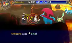 Minccino sings a lullaby and multicolored music notes come out of its mouth. When the opponent hears the lullaby, it falls asleep. | ||