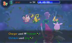 In Red Rescue Team and Blue Rescue Team Sing is a move with 17 PP and 100% accuracy. The user targets an enemy in front, while cutting corners, and puts them to sleep if possible. This move is affected by Magic Coat, Taunt and Muzzled status condition. Being a sound-based move, it is blocked by Soundproof.