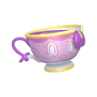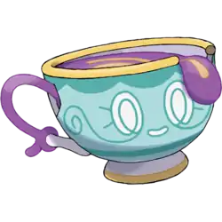 Sinistea is a Pokémon said to be created when a lonely spirit possesses a cold, leftover cup of tea. The teacup that Sinistea lives in is a famous piece of antique tableware; seafoam green in color with a lacy pattern that resembles a face and gold rims. However, there are many forgeries in circulation. Antique Form Sinistea has a mark of authenticity on the bottom of the cup, whereas Phony Form Sinistea lacks it. This mark appears as a light grey emblem on the bottom inside rim of the cup.