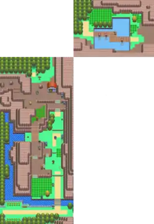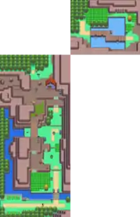 West of Floaroma Town, the route splits into two directions: Eterna Forest to the top, Valley Windworks to the right. On the way to Eterna Forest, there is a flowing stream that leads north to the Fuego Ironworks and east to another part of the Valley Windworks. A bridge crosses the stream, and Team Galactic Grunts block access to the route north of the stream until the team is defeated in the Valley Windworks. Immediately across the bridge is a large patch of grass and a Honey Tree. Going further north on the right side, there are few Trainers and a patch of soft soil. The right path is a dead end, due to a series of ledges going down the hill face. The left path is more complex, with a small bridge after the start of the hilly section, followed by a large patch of tall grass and several Trainers ready for battle. A bit further up is a house containing a lady that will heal the player's Pokémon. On the left, there will be a ledge, where the route comes from Fuego Ironworks, while on the right is a pathway up to the northern segment, but it is blocked by a Cut tree. To the north is an entrance of Eterna Forest.