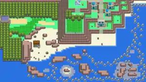 When leaving Valor Lakefront, the player can see three suites and a hotel. In the suite on the left, a clown will give the player TM92 (Trick Room), and in the suite requiring Rock Climb to get to, a lady will give the player the Coin Toss Pokétch App. In the hotel, if the player talks to the police officer he will heal their Pokémon. South of the hotel, there is a beach with two Trainers. Following the sandy beach west, the player will find Dr. Footstep's house. South of the house, there is a hidden Heart Scale. North of the house, there is a climbable ledge leading to a grass patch and item, and a breakable rock hiding a Honey Tree on the right and left respectively. Further north, there is a grass patch leading the player to Pastoria. North of the grass patch, there is a Berry patch.