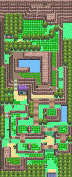 A mountainous route that connects the Fight Area and Survival Area. In the southern part of the route, there are multiple small, raised areas connected by bridges. In the middle of the route, there is a house and a small lake. In the northern part of the route, there are two patches of grass and a ledge.