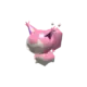 Skitty is a pink, feline Pokémon with a stumpy body and four short legs. On its face is a cream-colored, crescent-shaped marking. It has slit-like eyes and tufted ears with purple interiors. Its slender tail has a bulky pink section at the end, terminated by three pin-like structures with yellow ball-like tips. In battle, its tail puffs out and it threatens opponents with a sharp growl.