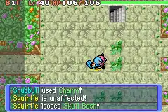 In Red Rescue Team and Blue Rescue Team and Explorers of Time and Darkness and Sky, Skull Bash is a move with 10 base power, 100% accuracy, and 15 PP. This attack hits enemy in the front; this move's damage is doubled at the end of damage calculation. Unlike in main series, the Defense boost exists only in the charging phase. Being a two-turn move, this move cannot be linked.