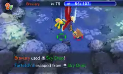 Braviary grabs the opponent with his talons and lifts them high into the air. He then speeds down towards the ground and flies away at the last second, dropping the opponent to the ground with great force. | ||