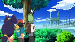 Skyarrow Bridge is a huge suspension bridge that connects Pinwheel Forest and Castelia City, and the largest bridge in Unova like in the games. A small Poké Mart is located nearby, having food and a telephone system. Prior to the bridge's construction, a water taxi service operated by Sally and her father helped travelers cross the river. A departure building and an old storage building for ferry supplies also once stood there. Additionally, there is a nearby road meant for transportation.