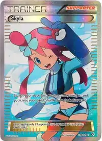 Skyla allows the player to search their deck for a Trainer card, show it to their opponent, and add it to their hand before shuffling the deck.