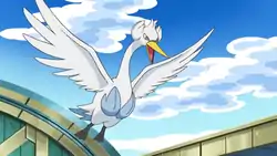 Swanna is one of Skyla's three Pokémon. In Skyla's battle with Cilan, it was able to defeat his Crustle. It struggled a bit battling Stunfisk, which it had a type disadvantage with and was also burned by its Scald. However, thanks to its Aqua Ring, it was able to overcome its burn and defeated Stunfisk. It appeared again in Ash's Gym battle against Skyla in An Amazing Aerial Battle!. Similarly to Cilan's Stunfisk, who had a type advantage, Pikachu fell to Swanna. Tranquill battled against Swanna and won thanks to an evolution into Unfezant and learning the move Aerial Ace. | ||
