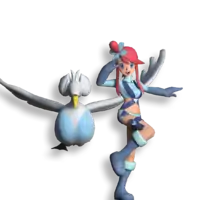 Skyla's design is based on her appearance in Pokémon Black, White, Black 2, and White 2. Swanna is Skyla's signature Pokémon in the core series games. Swanna's Dex entry comes from Pokémon Black 2 and White 2.