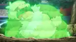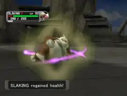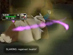 | Slaking yawns and relaxes. The injured parts of its body then sparkle with white energy and its body becomes momentarily covered in a light green, waving aura, restoring its lost health. | |||