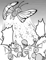 Butterfree flaps its wings above the opponent and a blue, shining powder is released from them, instantly putting the opponent to sleep. | ||
