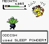 Oddish releases a blue, sparkling powder from the leaves on top of its head. Anything that goes into this powder will instantly fall asleep. | ||