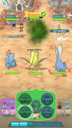 Bulbasaur releases a seed from the back of its bulb at the opponent. The seed explodes above the opponent and releases spores from it, making the opponent fall asleep. | ||