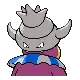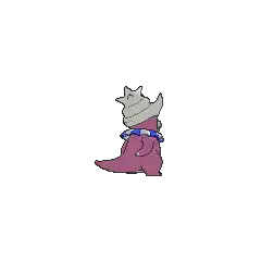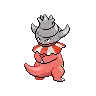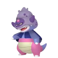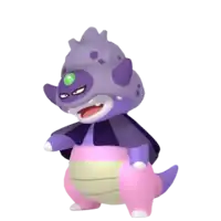 In Galar, Shellder's bite causes a different chemical reaction in the brain due to the Galarica spices that make up Galarian Slowpoke's diet, causing Galarian Slowking to take on a unique appearance. It has a slight color difference with purple spots on its tail and paws, and has a long black collar. The Shellder has grown more dominant, appearing completely different with a darker gray coloration and larger size, covering Slowking's eyes and nostrils. At the center is a purple spot with a green orb and two black eyes. The horns on top of shell are three round spikes with two more spikes on the middle of shell. The bottom parts are sharp with two purple shaped tubes from which poison may be secreted. The Shellder's teeth have also grown in size and are broad and flat instead of sharp; the same holds true for its wearer.