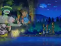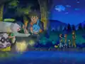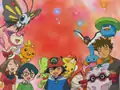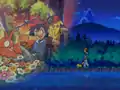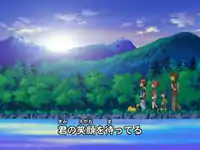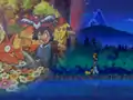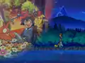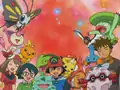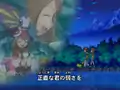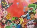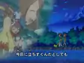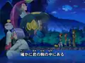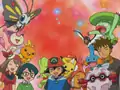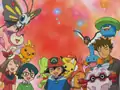 Ash and Pikachu are walking along the riverbank at night in the background, while short clips play in the foreground. Ash is lying against the tree, while Treecko/Grovyle rests on another tree. Pikachu jumps onto Ash's knees, Corphish and Torkoal walks towards Ash, and Taillow/Swellow flies and lands on the tree that Treecko/Grovyle is on. Pikachu jumps onto Ash's hat and onto his shoulders. Ash puts his hat on Pikachu's head and smiles. May joins Ash and Pikachu in the background. May is alone under a lotus leaf, feeling sad. Torchic/Combusken, Skitty and Bulbasaur walk, Beautifly flies toward May. She looks at her Pokémon, wipes off a tear with her finger, and smiles. Max and Brock joins Ash, Pikachu and May in the background. Brock is cooking a wok of soup, while Max, Mudkip, Forretress and Lotad/Lombre looks at him. He takes a sip and nods his head. Max smiles. On a stack of rocks, Jessie, James, Wobbuffet and Chimecho are awake, and Meowth, Seviper, Dustox and Cacnea are sleeping. The short clips end and in the background, the sun rises over the mountain. Finally, a group shot is shown.