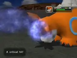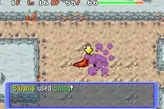 | Slugma melts its body into a lava-like puddle and crawls under the opponent. It then opens a hole in its body like a volcano and releases a black smoke from it. | |||