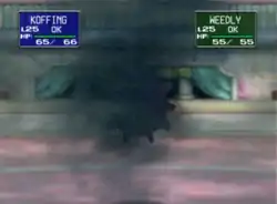 A thick dark green fog pours out of the holes covering Koffing's body. | ||