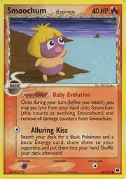 Smoochum δ (Japanese: ムチュール δ Muchul δ) is a Fire-type Basic Pokémon card. It is part of the EX Dragon Frontiers expansion.