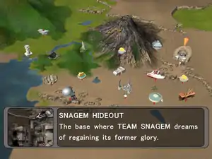 Snagem Hideout (Japanese: スナッチ団のアジト Team Snatch Hideout) is a location in Orre. It is the base of the villainous Team Snagem. According to an early news report in Pokémon Colosseum, it is located in a part of Orre known as Eclo Canyon.
