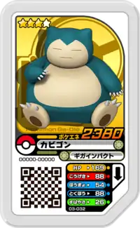 Snorlax (Japanese: カビゴン Kabigon) is a Grade 3 Pokémon Ga-Olé disk. It is part of the third set.