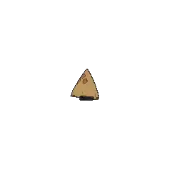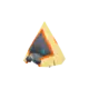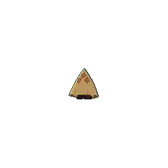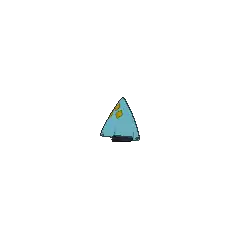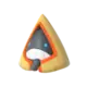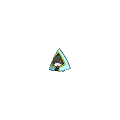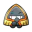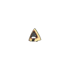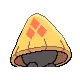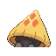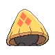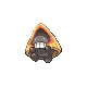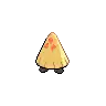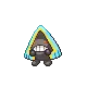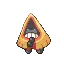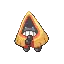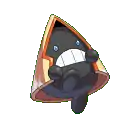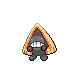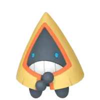Snorunt is a small, black Pokémon with an ovoid body. It has circular, light blue eyes, wide teeth, and spherical hands and feet that lack digits. It is covered with a yellow cloak that gives it a triangular outline. The coat is rimmed with an orange stripe and has three orange diamond markings on the back. As its evolution Glalie has a body of rock, Snorunt may also be made of rock.