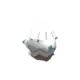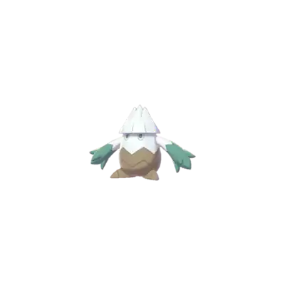 Snover is a Pokémon with a white upper body and brown lower body that resembles a snow-covered tree. It will be two-thirds brown if male and two-thirds white if female. It has green eyes and three points on top of its head. Its feet and green tail are stubby, and there are two green spikes that resemble pinecones on its back. Five cones form its hand: a large central cone with four smaller cones around it. Edible white Berries grow along Snover's midsection.