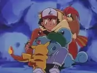As the brutal snowstorm rages on, Charmander's tail flame starts to weaken from trying to keep everyone warm. Ash tells Charmander to get back into its Poké Ball, but it refuses, but Ash calls it back anyway, much to Charmander's shock. Ash then figures that the Pokémon should be warm inside their Poké Balls. So, he tells Bulbasaur and Squirtle back into their Poké Balls, and like Charmander, they refuse too. Ash calls them back anyway, much to their surprise. Ash then attempts to call Pikachu back into his Poké Ball, but Pikachu refuses, and he clings onto Ash. Ash is touched by Pikachu's gesture of trying to keep his Trainer warm and he accepts his decision.