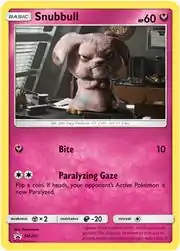 Snubbull (Japanese: ブルー Bulu) is a Fairy-type Basic Pokémon card. It is one of the SM Black Star Promos.